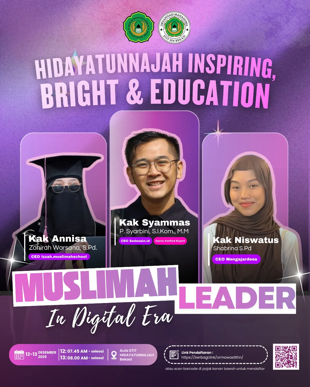 Kegiatan ini dirancang sebagai ajang edukasi dan inspirasi bagi mahasiswa dan masyarakat umum, khususnya muslimah, melalui rangkaian workshop dan seminar yang akan mengusung tema aksi sosial, keterampilan digital, kepemimpinan, dan personal branding.